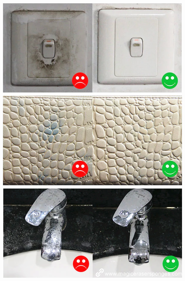 The using area of magic eraser sponge is very versatile, suitable for household goods (porcelain, coffee mugs, dishes, sofas, tables, chairs, doors, windows, wallpaper, laminate flooring, glassware); office supplies (such as computers, telephones, copiers, desks chairs, etc.); household electrical appliances (such as refrigerators, microwave ovens, televisions, VCD, etc.), stainless steel products (such as hand-washing dish, vegetables dish), bathroom products (such as bathtubs, tile, toilet) and so on.
